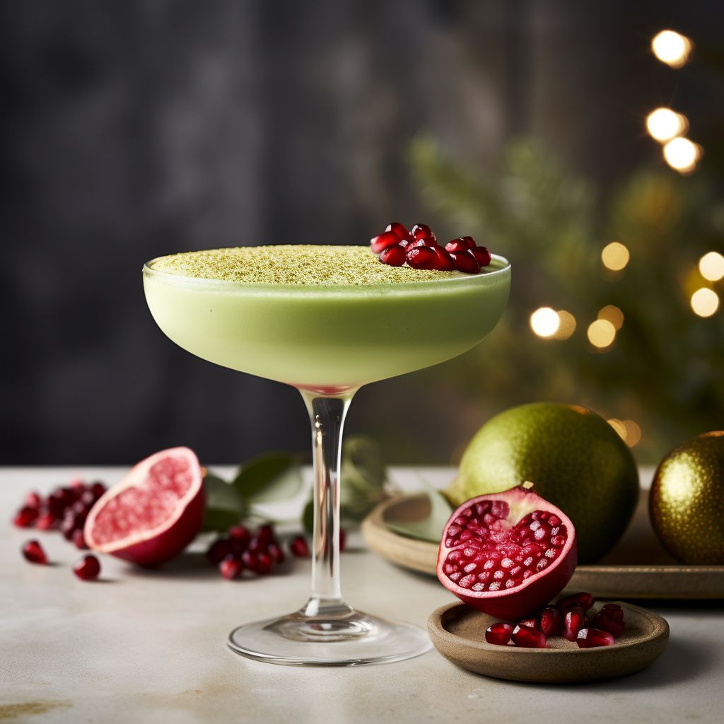 Barista's Secret: Want to add a touch of barista-style flair to your martini? Give your cocktail a vigorous shake with ice to introduce air and create an alluring frothy layer on top. It's not just visually captivating; this frothy cloud also holds a functional secret — it acts as a delicate platform for your pomegranate arils. Carefully place them atop this foamy layer, and watch as they sit suspended like little jewels atop your pistachio emerald potion.